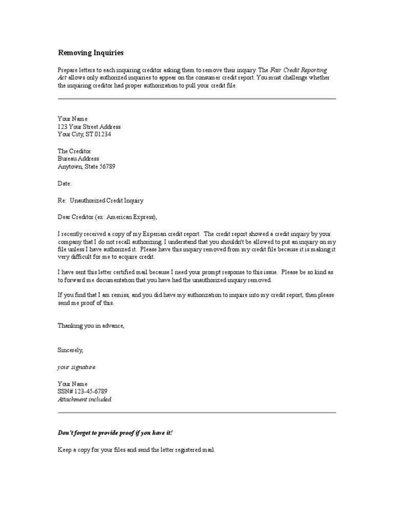 Sample Credit Inquiry Removal Letter Qfinance from www.qfinance.com The only inquiries authorized on your credit report are those who can claim permissible purpose. Get the address of each creditor whom you did. In order to remove hard inquiries from your credit report, you will have to write a dispute letter to all three major credit bureaus. Hard inquiries stay on your credit report for two years, though their impact on your credit score lasts for less time, typically about one year. Here's what you need to know about hard inquiries, how they affect your credit score and how to dispute one in your credit report. Credit scoring is all about your risk of defaulting on a loan and the calculation of risk taken by a lender to is it possible to remove a hard inquiry? An unauthorized hard inquiry could hurt your credit scores. How to remove credit inquiries from credit reports 2021?